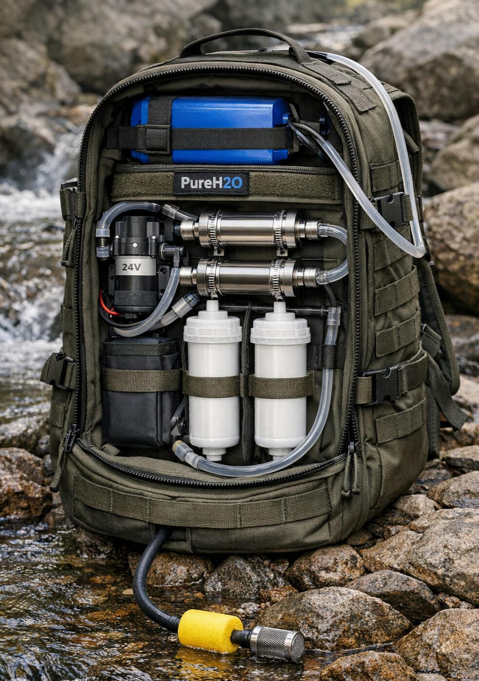 Clean water. Anywhere. The fisrt modular backpack with integrated mult-stage filtration and 24V battery system. Buit for outdoor, nautical and emergency use.